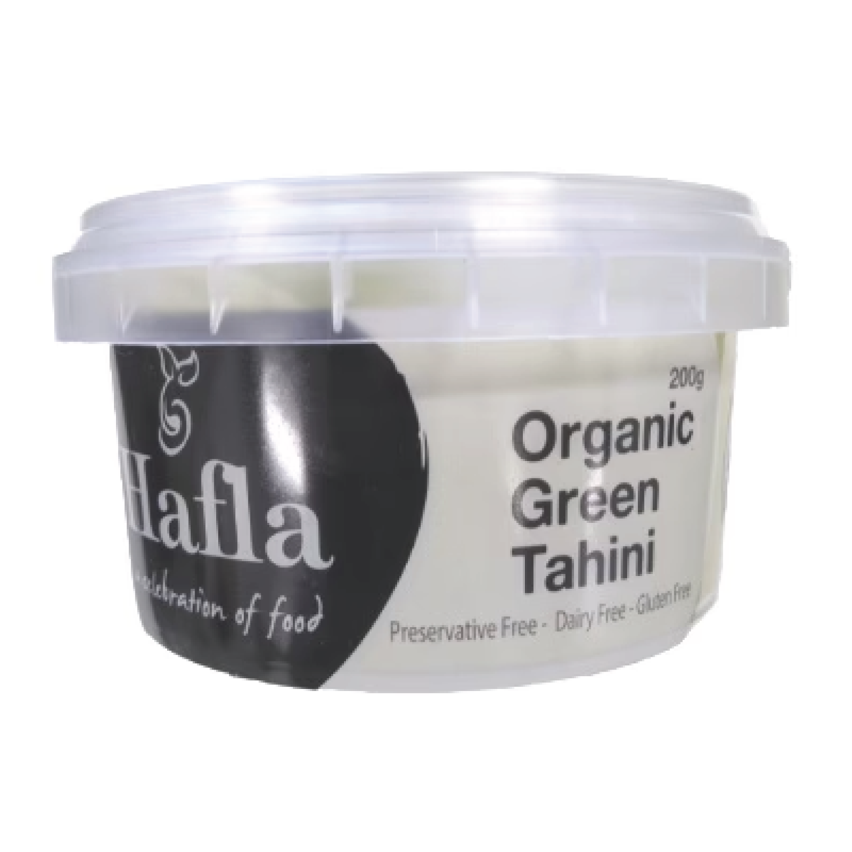 A creamy, vibrant Green Tahini dip in a 200g tub. Hafla Organic Green Tahini blends organic sesame paste with fresh parsley and spices, offering a powerful, gluten-free and vegan drizzle for all your favourite meals.